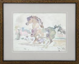 <span class='ref_item'>117 -</span> <span class="object_title">"CABALLO"</span>   <p><span class="author">EMILIO GRAU SALA  </span> <br><span class="technique_material">Técnica mixta sobre papel</span><br><span class="technical_description">Se representa un caballo a galope y una columna jónica al fondo. Realizado en acuarela, finas líneas negras a tinta y líneas verdes rodeando la silueta de las figuras. Firmado a mano por el autor en el ángulo inferior derecho.<br/>Enmarcado en marco de madera pintado en negro y dorado, con paspartú beige y cristal. Ligeros desperfectos en el papel y en el marco. Medidas con marco: 54.5 x 67cm<br/> </span><br></p>