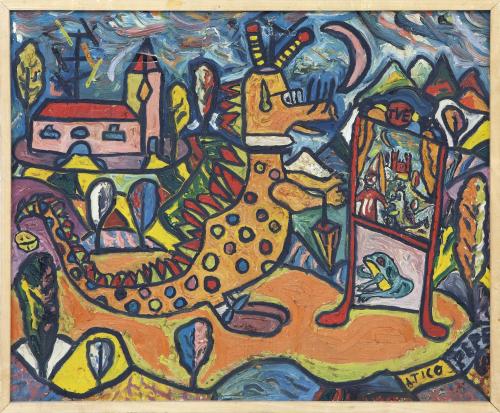 <span class='ref_item'>123 -</span> <span class="object_title">EL DRAGÓN DE LA TELE</span>   <p><span class="technique_material">Óleo sobre lienzo</span><br><span class="technical_description">Lienzo restaurado por roturas en la parte superior.<br/>Firmado PEPE en la esquina inferior derecha. <br/>Enmarcado en madera. Roturas en el lienzo.<br/>Medidas con marco: 62,5x52cm</span><br></p>