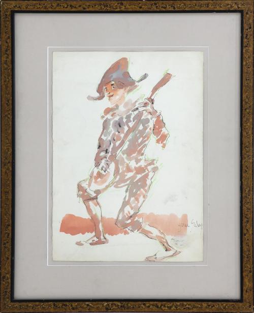 <span class='ref_item'>118 -</span> <span class="object_title">"ARLEQUÍN"</span>   <p><span class="author">EMILIO GRAU SALA  </span> <br><span class="technique_material">Técnica mixta sobre papel</span><br><span class="technical_description">Se representa un arlequín tocando un instrumento musical. Realizado con acuarela en tonos salmón, finas líneas negras a tinta y líneas verdes rodeando la silueta de la figura. Firmado a mano por el autor en el ángulo inferior derecho.<br/>Enmarcado en marco de madera pintado en negro y dorado, con paspartú beige y cristal. Ligeros desperfectos en el papel y en el marco. Medidas con marco: 68 x 54cm</span><br></p>