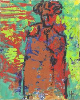 <span class='ref_item'>159 -</span> <span class="description">EL MAESTRO </span>  <p><span class="description">ISIDORO LÁZARO FERRÉ (1949) <br>Óleo sobre lienzo<br>Figura abstracta en rojo de un torero sobre fondo en tonos verdes y rojos.<br>Firmado en el ángulo inferior derecho.<br>Al dorso titulado, firmado y dedicado.<br>Sin enmarcar.<br>73x60 cm.</span></p>