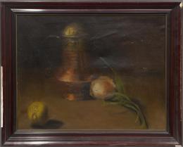 <span class='ref_item'>154 -</span> <span class="description">BODEGÓN CON TETERA, CEBOLLA Y LIMÓN </span>  <p><span class="description">ESCUELA ESPAÑOLA CONTEMPORÁNEA <br>Óleo sobre lienzo<br>Enmarcado en madera, con desperfectos y roturas.<br>Medidas: 57 x 66cm con marco. 47 x 55cm sin marco</span></p>