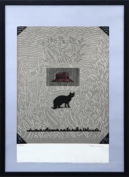 <span class='ref_item'>156 -</span> <span class="description">"UN DÍA EN LA GRAN VÍA" (1999) </span>  <p><span class="description">FERNANDO BELLVER (Madrid-1954) <br>Aguafuerte<br>Muestra un gato bajo la sombra de un sombrero sobre una vista del edificio Metrópolis de Madrid.<br>Firmado y numerado a lápiz en zona inferior. Numeración: 218/230<br>Enmarcado con marco negro y metacrilato.<br>Medidas con marco: 73x53cm</span></p>