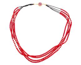 <span class='ref_item'>18 -</span> <span class="object_title">COLLAR EN PLATA DE LEY, RUBIES, DIAMANTES, ESPINELAS Y CORAL</span>  <p><span class="technical_description">Collar de 4 hilos realizado en plata de ley chapada en oro, con espinelas negras y coral. Broche con rubíes y diamantes . Cierre: Caja con lengüeta <br/>Longitud: 78.5 cm<br/>ref. 16368</span><br>Peso: <span class="PESO_HCES1">114</span> <span class="PESOUMED_HCES1">gr.</span><br></p>