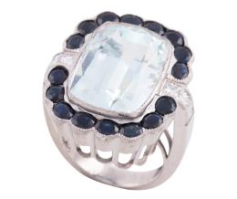 <span class='ref_item'>16 -</span> <span class="object_title">SORTIJA DE CÓCTEL EN ORO DE 18 KT. GRAN AGUAMARINA 19.42 CT. ZAFIROS Y DIAMANTES</span>  <p><span class="technical_description">Sortija de cóctel realizada en oro de 18 kt. de estilo Art Decó, con gran Aguamarina central talla cojín corte mixto con peso de ( 19.42 ct), estimación de color: Very Light Blue , Transparent ,va rodeada por dieciséis zafiros en talla oval con peso total aprox.( 1.95 ct )y adornada también por seis diamantes en talla princesa con peso total aprox.(0.60ct). Se acompaña de Certificado Geológico ALGT Nº79677660 de la esmeralda.<br/>Medida sortija: 14<br/>Peso: 19,5 gr</span><br></p>