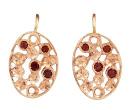 <span class='ref_item'>21 -</span> <span class="object_title">PENDIENTES EN ORO DE 18 KT. CON FORMA OVAL IRREGULAR Y GRANATES</span>  <p><span class="technical_description">Pareja de pendientes realizados en oro de 18 kt. con forma oval irregular calada en su parte interior y adornada por tallas redondas de granates.<br/>Cierre: Gancho<br/>Peso: 4,4 gr</span><br></p>