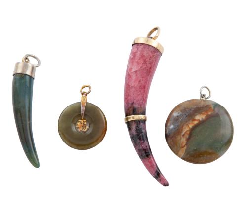<span class='ref_item'>8 -</span> <span class="object_title">LOTE DE CUATRO COLGANTES DE CUARZO UNO DE ELLOS DE RODONITA Y ASA Y ADORNOS EN METAL DORADO</span>  <p><span class="technical_description">Lote compuesto por cuatro colgantes dos de ellos con forma circular y los otros dos con forma de cuerno o colmillo . Los dos circulares y uno de los cuernos están realizados en cuarzos, el cuarto esta realizado en rodonita. Todos llevan asa para colgar y adornos en metal dorado<br/>Peso total: 41,7 gr</span><br></p>