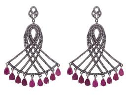<span class='ref_item'>241 -</span> <span class="object_title">PENDIENTES EN PLATA DE LEY 925 PAVONADA, RUBÍES Y DIAMANTES</span>  <p><span class="technical_description">Pendientes largos con movimiento realizados en plata de ley 925 pavonada. Diseño cruzado de bandas con diamantes en talla antigua engastados en grano con un peso total aprox de 2ct. En pendentif 9 tallas de rubíes en talla perilla engastados en garras con un peso total aprox de 8ct<br/>Cierre: Presión <br/>Longitud: 7cm</span><br>Peso: <span class="PESO_HCES1">24,7</span> <span class="PESOUMED_HCES1">gr.</span><br></p>