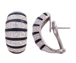 <span class='ref_item'>246 -</span> <span class="object_title">PENDIENTES BOMBEÉ EN ORO DE 18 KT. DIAMANTES Y ONIX</span>  <p><span class="technical_description">Pareja de pendientes diseño bombeé realizada en oro de 18 kt. con bandas horizontales de diamantes en talla brillante con peso total aprox( 0.45 ct) y franjas también horizontales adornadas por onix.<br/>Cierre: Omega<br/>Peso: 10.5 gr</span><br></p>