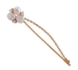 <span class='ref_item'>255 -</span> <span class="object_title">ALFILER EN ORO DE 18 KT. CON DIAMANTES Y PERLAS CULTIVADAS</span>  <p><span class="technical_description">Alfiler largo realizado en oro de 18 kt. con cabeza adornada por tres diamantes en talla brillante con peso total aprox ( 0.05 ct) y tres perlas cultivadas con forma aplanada.<br/>Cierre: Mecanismo de seguridad y cadena<br/>Longitud: 6 cm<br/>Peso: 3 gr</span><br></p>