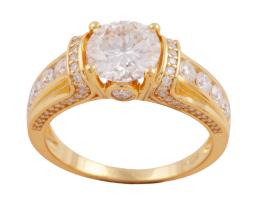 <span class='ref_item'>253 -</span> <span class="object_title">ANILLO EN PLATA DE LEY 925 CHAPADO EN ORO Y MOISSANITAS</span>  <p><span class="technical_description">Anillo realizado en plata de ley 925mm chapado en oro, montando una moissanita con peso (2ct) sobre garras vistas y cuatro pequeñas moissanitas a cada lado.<br/>Talla: 16<br/>Peso total: 4.1gr</span><br></p>