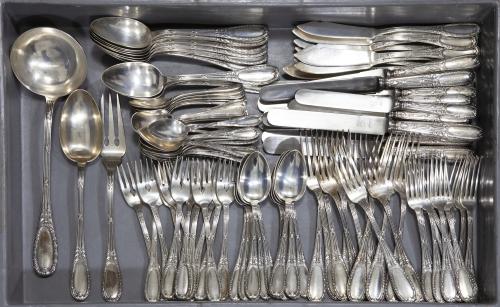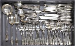 <span class='ref_item'>258 -</span> <span class="object_title">CUBERTERIA EN PLATA DE 916 MM</span>  <p><span class="technical_description">Cubertería realizada en plata de 916, piezas con punzón.<br/>12 unidades de cuchillos pequeños, 12 de grandes. 12 tenedores pequeños , 12 grandes, 12 cucharas pequeñas, 12 grandes , 12 servicios de pescado, 12 cucharillas postre , 12 palas helado, <br/>Piezas de servicio: Cazo, cucharon y tenedor. <br/>Peso neto aprox plata: 6.070 gr <br/>Peso bruto total: 7.660 gr</span><br></p>