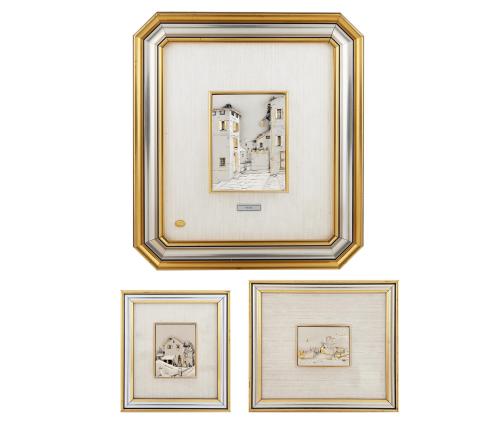 <span class='ref_item'>257 -</span> <span class="object_title">TRES BAJORRELIEVES EN PLATA DE LEY 800/00</span>  <p><span class="technical_description">Lote formado por tres bajorrelieves realizados en plata de ley 800/00 representando una ciudad italiana. Presenta estructuras con detalles en relieve dorado creando un efecto tridimensional.<br/>Enmarcados en paspartú beige y marcos octogonales de madera de color dorado y plateado. <br/>El primero presenta una placa metálica de autor en la parte baja titulada Vicolo.<br/>Medidas: 43 x 38cm,  21 x 24cm  y  19.5 x 17.5cm<br/> </span><br></p>