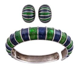 <span class='ref_item'>33 -</span> <span class="object_title">CONJUNTO DE BRAZALETE Y PENDIENTES EN PLATA DE LEY 925 Y ESMALTES</span>  <p><span class="technical_description">Lote formado por conjunto de brazalete y pareja de pendientes realizados en plata de ley 925 mm y adornados con franjas de esmaltes azules y verdes<br/>Cierre pendientes : Omega<br/>Peso total: 68.6 gr<br/> </span><br></p>