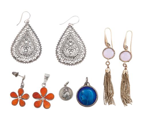 <span class='ref_item'>32 -</span> <span class="object_title">DOS PAREJAS DE PENDIENTES UN PENDIENTE Y UN COLGANTE  Y DOS MEDALLAS EN PLATA BAJA Y METAL</span>  <p><span class="technical_description">Lote formado por dos pares de pendientes largos realizados en plata baja con adorno de filigrana, cuarzos rosa y colgante y un pendiente con adornos anaranjados . Dos medallas , la pequeña con la figura de San Antonio en plata baja y otra con esmalte azul y figura de Virgen en metal<br/>Peso total: 26,80 gr</span><br></p>