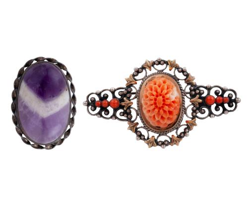 <span class='ref_item'>23 -</span> <span class="object_title">DOS BROCHES EN PLATA DE LEY 925, CORAL Y ÁGATA.</span>  <p><span class="technical_description">Lote formado por dos broches realizados en plata de ley 925 mm , uno de ellos de forma horizontal con ovalo central, lo adorna un centro tallado en coral y a los lados cuentas esféricas de coral, esta hecho en filigrana y tiene partes doradas.<br/>El otro broche sirve también como colgante y tiene un ágata bandeada en tonos violetas y purpura en talla cabujón oval, lleva bisel calado.<br/>Cierres: Agujas con mecanismo de seguridad<br/>Peso total: 28,40 gr</span><br></p>