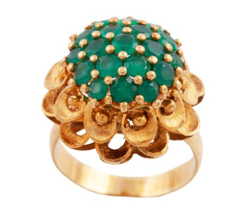<span class='ref_item'>41 -</span> <span class="object_title">SORTIJA  CON ROSETA ALTA EN ORO DE 18 KT.Y ESMERALDAS</span>  <p><span class="technical_description">Sortija con diseño de roseta alta realizada en oro de 18 kt. con cuajado central de esmeraldas en tallas redondas y peso total aprox( 1 ct)<br/>Medida sortija: 10<br/>Peso: 6,2 gr</span><br></p>