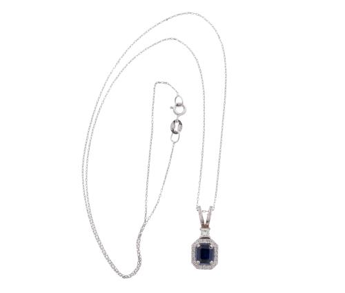 <span class='ref_item'>36 -</span> <span class="object_title">COLGANTE Y CADENA EN ORO DE 18 KT. ZAFIRO Y DIAMANTES</span>  <p><span class="technical_description">Colgante con cadena realizados en oro de 18 kt. El colgante con zafiro central en talla esmeralda rectangular engastado en garra y con peso aprox ( 1 ct) , adornado por diamantes en talla brillante con peso total aprox(0.20 ct).La cadena de pequeño eslabón barbado y cierre con reasa. Longitud: 40cm<br/>Peso: 2,4 gr</span><br></p>