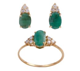 <span class='ref_item'>88 -</span> <span class="description">CONJUNTO DE SORTIJA Y PENDIENTES EN ORO DE 18KT, ESMERALDAS Y DIAMANTES</span>  <p><span class="description">Conjunto de sortija y pendientes realizados en oro de 18kt. Con esmeraldas centrales en talla oval engastadas en garras, con un peso total aprox de 2.75ct. Detalle de diamantes en talla brillante engastados en garras, con un peso total aprox de 0.38ct.<br>Medida Sortija: 15<br>Cierre Pendientes: Presión<br>Peso: 3,50 gr.</span></p>