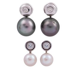<span class='ref_item'>102 -</span> <span class="object_title">DOS PARES DE PENDIENTES EN ORO 18KT, PERLAS CULTIVADAS Y DIAMANTES</span>  <p><span class="technical_description">Lote de dos parejas de pendientes realizados en oro de 18kt. En la parte inferior con perlas cultivadas, en una pareja color blanco calibradas aprox en 8,9mm y en la otra perlas tahití calibradas aprox en 12,5mm. En la parte superior diamantes en talla brillante, engastados en chatón, con peso total aprox 0.50ct (0.30ct los de perlas blancas, 0.20ct los de tahití)<br/>Cierre: Omega<br/>Peso: 25,1gr (8,3gr blancas, 16,8gr tahití)</span><br></p>