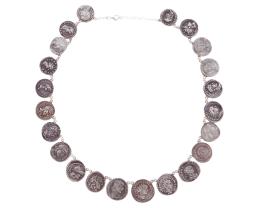 <span class='ref_item'>99 -</span> <span class="object_title">COLLAR CON DENARIOS EN PLATA DE LEY</span>  <p><span class="technical_description">Collar realizado en plata de ley 925. Formado por 22 denarios, también en plata de ley, de diferentes fechas y emperadores<br/>Cierre: Mosquetón<br/>Longitud: 44cm (+4cm de alargador)</span><br>Peso: <span class="PESO_HCES1">72,80</span> <span class="PESOUMED_HCES1">gr.</span><br></p>