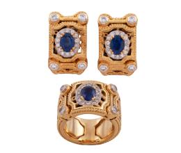 <span class='ref_item'>93 -</span> <span class="object_title">CONJUNTO DE SORTIJA Y PENDIENTES " YANES" COLECCIÓN ALHAMBRA  EN ORO DE 18 KT. ZAFIROS Y DIAMANTES</span>  <p><span class="technical_description">Lote formado por conjunto de sortija y pareja de pendientes " YANES COLECCIÓN ALHAMBRA" , realizados en oro de 18 kt. Ambos con la filigrana calada y matizada característica de la colección. La sortija con zafiro central en talla oval y peso aprox ( 1 ct ) adornado por diamantes en orla y vértices en talla brillante con peso total aprox(0.50 ct).Medida sortija : 12. La pareja de pendientes llevan zafiros centrales con peso total aprox ( 2 ct ) y van adornados por diamantes en talla brillante con peso total aprox ( 1 ct ).Cierre: Omega<br/>Peso total aprox de los zafiros: 3 ct. Peso total aprox de los diamantes 1.5 ct<br/>Ref: 1.75.3726<br/>Peso total : 41,3 gr</span><br></p>