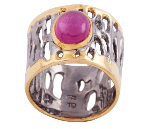 <span class='ref_item'>95 -</span> <span class="description">SORTIJA EN PLATA 925 CON CHAPADO EN ORO Y RUBÍ. JOYERÍA DE AUTOR, PIEZA ÚNICA</span>  <p><span class="description">Sortija realizada en plata de ley 925 con contraste y partes chapadas en oro. Ancha y calada, con rubí en cabujón oval de peso aprox 2ct<br>Medida Sortija: 16<br>Peso: 9,60 gr.</span></p>