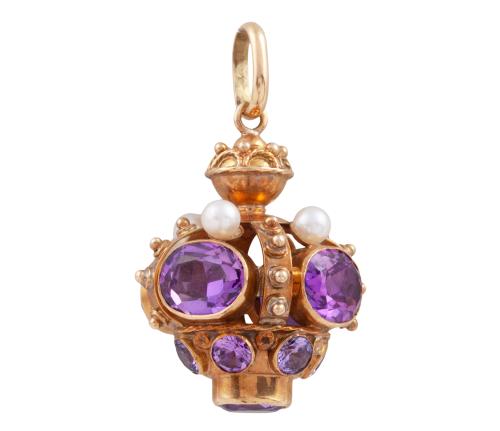 <span class='ref_item'>98 -</span> <span class="object_title">COLGANTE  EN ORO DE 18 KT, CON ZAFIROS VIOLETA SINTETICOS Y PERLAS CULTIVADAS</span>  <p><span class="technical_description">Colgante antiguo realizado en oro de 18 kt con diseño en forma de corona, estilo neoetrusco con acabado granulado, adornado por zafiros sintéticos en intenso color violeta y perlas cultivadas calibradas aprox en (4,5 mm).Con asa muy ancha para colgar.<br/>Medidas: 4 x 2,5 mm<br/>Peso:14,9 gr</span><br></p>