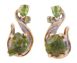 <span class='ref_item'>167 -</span> <span class="object_title">PENDIENTES EN PLATA 925 CON CHAPADO EN ORO Y PERIDOTOS. JOYERÍA DE AUTOR, PIEZA ÚNICA</span>  <p><span class="technical_description">Pareja de pendientes realizados en plata de ley 925 con contrastes y partes chapadas en oro. Diseño en forma de "S" con cristales en bruto de peridotos y en su parte superior, peridotos tallados en perilla y redondo, todos ellos con peso total aprox 7.62ct (7ct los cristales en bruto, 0.62ct los tallados)<br/>Cierre: Presión<br/>Longitud: 2,5cm</span><br>Peso: <span class="PESO_HCES1">8,6</span> <span class="PESOUMED_HCES1">gr.</span><br></p>