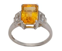 <span class='ref_item'>166 -</span> <span class="description">SORTIJA EN ORO BLANCO DE 9KT, CITRINO, AGUAMARINAS Y DIAMANTES</span>  <p><span class="description">Sortija realizada en oro blanco de 9kt. Con un citrino en talla esmeralda con un peso total aprox (3.4ct), dos aguamarinas en talla baguette con un peso total aprox (0.5ct) y diamantes.<br>Medida Sortija: 14<br>Ref: 15120-1<br>Peso: 3,1 gr.</span></p>