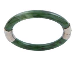 <span class='ref_item'>148 -</span> <span class="object_title">BRAZALETE DE JADE CON METAL PLATEADO</span>  <p><span class="technical_description">Brazalete realizado en jade verde con bisagra y broche en metal plateado.<br/>Cierre: caja con lengüeta<br/>Medida interior: 6,5 cm<br/>Peso total: 46,5 gr<br/> </span><br></p>