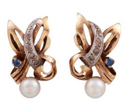 <span class='ref_item'>154 -</span> <span class="object_title">PENDIENTES ANTIGUOS  EN ORO DE 14 KT. Y PLATA DE LEY CON PERLAS CULTIVADAS Y  ADORNO DE PIEDRAS</span>  <p><span class="technical_description">Pareja de pendientes antiguos realizados en oro de 14 Kt. Con diseño de hoja, adornados por perlas cultivas calibradas aprox(5mm),piedrecitas de color y banda de piedras blancas sobre vista en plata.<br/>Cierre: Ballestilla<br/>Peso: 4 gr<br/> </span><br></p>