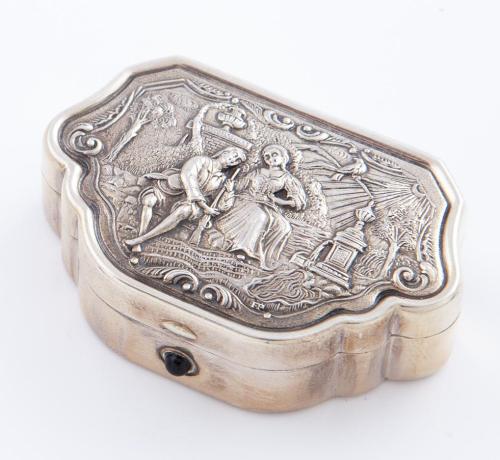 <span class='ref_item'>150 -</span> <span class="object_title">CAJA PASTILLERO EN PLATA DE LEY</span>  <p><span class="technical_description">Caja pastillero realizado en plata de ley con fina decoración repujada. En la tapa superior se representa una escena cortesana del S.XVIII con una pareja en galanteo. En su parte inferior un óvalo con motivo floral y tornapuntas. Detalle de piedra negra en el cierre. Con punzones de platero.<br/>Medidas: 5 x 3 x 1,4cm<br/>Peso total: 37,2gr</span><br></p>