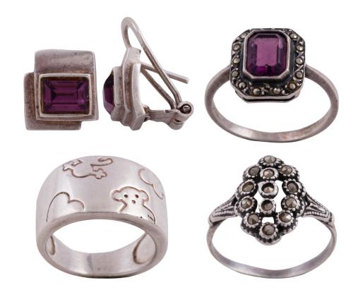 <span class='ref_item'>163 -</span> <span class="object_title">LOTE DE CONJUNTO DE SORTIJA Y PENDIENTES CON PIEDRAS VIOLACEAS Y UNA SORTIJA DE "TOUS" Y OTRA CON MARCASITAS EN PLATA 925</span>  <p><span class="technical_description">Lote compuesto por pareja de pendientes y sortija , adornados con piedras violaceas , una sortija ancha con el oso de" Tous"y otra sortija con diseño antiguo y con marcasitas. Todo realizado en plata 925.<br/>Pendientes cierre: Omega. Medida sortijas : 12 y 11<br/>Peso total: 15.4 gr</span><br></p>