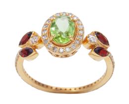 <span class='ref_item'>183 -</span> <span class="object_title">SORTIJA EN ORO DE 9KT, PERIDOTO, GRANATES Y DIAMANTES</span>  <p><span class="technical_description">Sortija realizada en oro de 9kt. Con un peridoto en talla oval, rodolitas y diamantes en talla brillante. Falta un pequeño diamante.<br/>Medida Sortija: 14<br/>ref. 15103-1</span><br>Peso: <span class="PESO_HCES1">2,40</span> <span class="PESOUMED_HCES1">gr.</span><br></p>