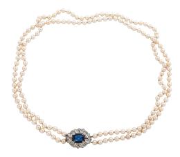 <span class='ref_item'>180 -</span> <span class="object_title">COLLAR DE DOS HILOS CON PERLAS CULTIVADAS Y BROCHE EN METAL CON PIEDRAS IMITACIÓN</span>  <p><span class="technical_description">Collar de dos hilos , con perlas cultivadas calibradas aprox ( 7 mm), y gran broche en metal adornado con piedra azul y piedras blancas imitación.<br/>Cierre: Caja con lengüeta <br/>Longitud: 70cm</span><br>Peso: <span class="PESO_HCES1">112</span> <span class="PESOUMED_HCES1">gr.</span><br></p>