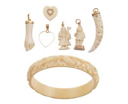 <span class='ref_item'>173 -</span> <span class="object_title">LOTE DE SEIS PIEZAS ANTIGUAS: CINCO COLGANTES  Y UNA PULSERA  EN ORO DE 18 KT. Y MARFIL  ANTIGUO</span>  <p><span class="technical_description">Lote compuesto por seis piezas realizadas en oro de 18kt y marfil antiguo, cinco colgantes con partes de oro de 18 kt. en bases y agarres de asas para colgar, con figuras de: un guerrero, un sabio , un cuerno calado, una higa y un corazón , completa el lote una pulsera rígida<br/>Peso total : 42,80 gr<br/> </span><br></p>