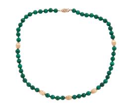 <span class='ref_item'>176 -</span> <span class="object_title">COLLAR CORTO DE MALAQUITA Y APLICACIONES Y CIERRE EN ORO 14 KT</span>  <p><span class="technical_description">Collar corto, compuesto por cuentas esféricas de malaquita, adornado con aplicaciones ovaladas y estriadas y con cierre de pestaña en oro de 14 kt <br/>Longitud:38 cm<br/>Peso: 20 gr</span><br></p>