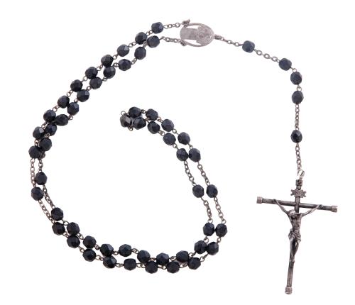<span class='ref_item'>188 -</span> <span class="object_title">ROSARIO ANTIGUO CON AZABACHE Y CRUCIFIJO EN PLATA 800</span>  <p><span class="technical_description">Rosario antiguo formado por cuentas facetadas de azabache. Con crucifijo realizado en plata 800 con la imagen de Cristo y el lema "INRI". Resto realizado en metal, incluida una medalla ovalada de la Virgen y el niño, con el lema "Ave María" y en la parte posterior el sagrado corazón de Jesús<br/>Longitud: 50cm</span><br>Peso: <span class="PESO_HCES1">28</span> <span class="PESOUMED_HCES1">gr.</span><br></p>