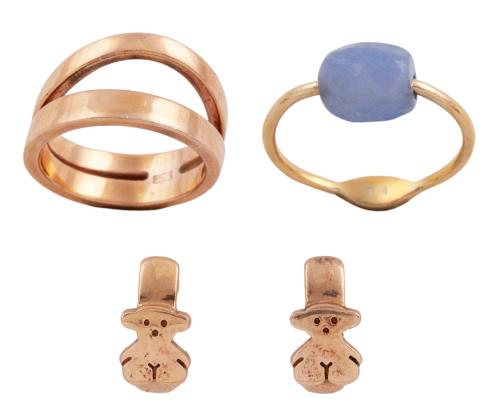 <span class='ref_item'>170 -</span> <span class="object_title">LOTE DE PENDIENTES Y DOS SORTIJAS, EN PLATA 925 CHAPADA EN ORO. LOS PENDIENTES Y UNA SORTIJA DE "TOUS"</span>  <p><span class="technical_description">Lote compuesto por dos sortijas y un par de pendientes realizados en plata 925 chapados en oro. Pendientes con el oso de "Tous" y cierre de ballestilla, la sortija de "Tous" adornada con una piedra de cuarzo azul y medida  10, y la segunda sortija ancha lleva dentro la grabación: 30 ABRIL 2005 y medida 10.<br/>Peso total: 11,4 gr </span><br></p>