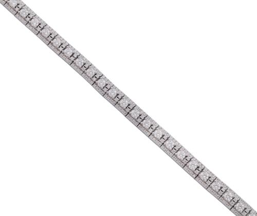 <span class='ref_item'>185 -</span> <span class="object_title">PULSERA EN PLATA DE LEY 925 Y MOISSANITAS</span>  <p><span class="technical_description">Pulsera articulada realizada en plata de ley 925 formada por 35 pequeños eslabones cuadrados. Cada eslabón con una moissanita central mas grande en talla brillante y otras mas pequeñas alrededor. Peso total aprox de las moissanitas (5ct). Cierre: caja con lengüeta y doble ocho de seguridad. Longitud: 19cm</span><br>Peso: <span class="PESO_HCES1">15,9</span> <span class="PESOUMED_HCES1">gr.</span><br></p>