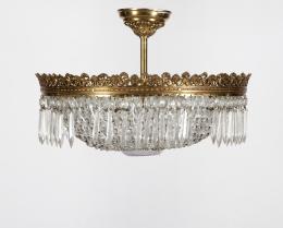 <span class='ref_item'>202 -</span> <span class="description">LÁMPARA DE TECHO DE CUATRO LUCES EN BRONCE Y CRISTAL. S.XX </span>  <p><span class="description">Lámpara de techo de cuatro luces de bronce y cristal "strass" en disminución y cazoleta central de cristal tallado<br>Falta un casquillo de la instalación eléctrica. Tiene una bombilla. <br>47 x 35 cm <br> </span></p>