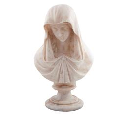 <span class='ref_item'>198 -</span> <span class="description">BUSTO VIRGEN MARÍA, S.XIX </span>  <p><span class="description">SEGUIDOR DE GIOVANNI STRAZZA (Milán, 1818-1875) Alabastro Escultura en alabastro que representa el rostro sereno de María, cubierta por un manto que queda sujeto por la estrella de su pecho. Colocada sobre una peana circular igualmente de alabastro. El detallismo del rostro y de los pliegues del velo evidencian el dominio en la técnica, propios de los modelos italianos del siglo XV y XVI. Leve rotura en la base. 33 cm.x19 cm.x12</span></p>