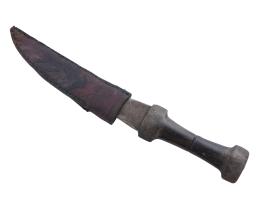 <span class='ref_item'>197 -</span> <span class="object_title">DAGA ANTIGUA EN ACERO Y EMPUÑADURA MADERA</span>   <p><span class="technical_description">Daga con hoja de acero y empuñadura en madera formado en dos piezas. Con funda original en piel marrón decorada con motivos geométricos.<br/>Pequeña falta en la parte inferior del mango.<br/>Medidas: 28cm</span><br></p>