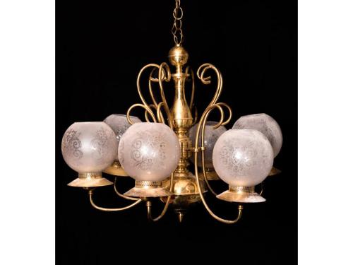 <span class='ref_item'>201 -</span> <span class="description">LÁMPARA DE TECHO ESTILO HOLANDÉS </span>  <p><span class="description">En metal dorado, de 6 luces con tulipas. Altura: 60 cm.</span></p>