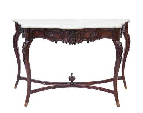 <span class='ref_item'>206 -</span> <span class="object_title">CONSOLA EN CAOBA Y MÁRMOL</span>   <p><span class="technical_description">Consola en madera de caoba con tapa de mármol, de inspiración rococó. El mármol en perfecto estado, la base de madera presenta inestabilidad y señales de uno.<br/>Medidas: 91 x 142,5 x 57cm</span><br></p>