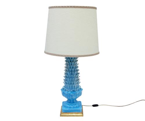 <span class='ref_item'>205 -</span> <span class="object_title">LÁMPARA DE MESA EN CERÁMICA DE MANISES, FÁBRICA BONDÍA (VALENCIA, AÑOS 60)</span>   <p><span class="technical_description">Lámpara de mesa en cerámica de Manises, fabricada por Bondía (Cuart de Poblet, Valencia). Modelo azul con cuerpo profusamente detallado con hojas de acanto. Tiene faltas en parte superior e inferior.<br/>Con gran pantalla color crema y ribeteada con trenzado beige.<br/>Sobre base de madera con pegatina de fábrica. Cable de alimentación.<br/>Medidas cuerpo: 74cm</span><br></p>