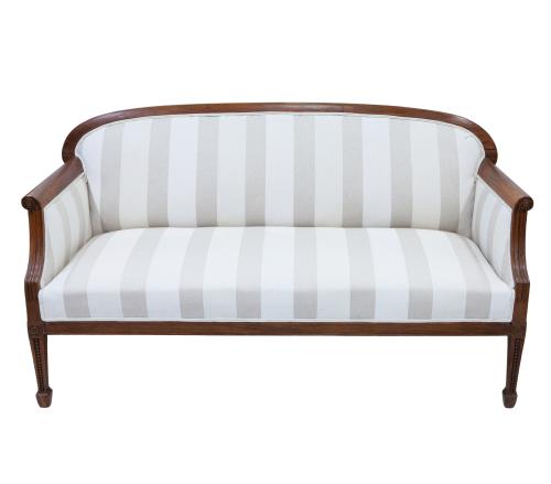 <span class='ref_item'>209 -</span> <span class="object_title">SOFÁ EN MADERA DE ROBLE, ESTILO IMPERIO. S. XX</span>   <p><span class="technical_description">Sofá en madera de roble con estructura tallada en patas y reposabrazos. Tapizado de rayas en color beige y gris claro. Madera con ligeros desperfectos por uso.<br/>Medidas: 151x85x55cm</span><br></p>