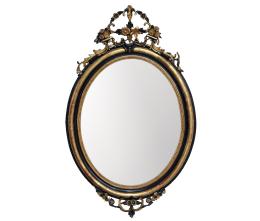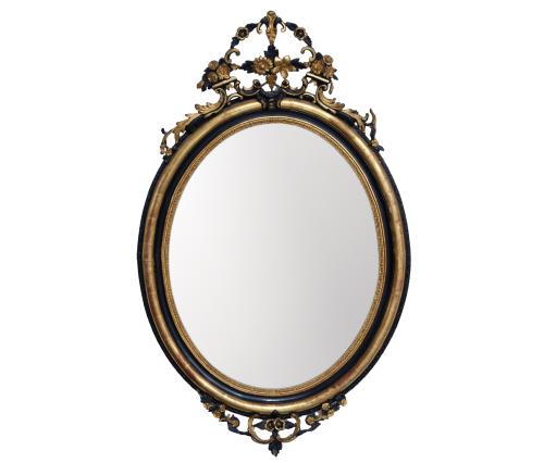<span class='ref_item'>215 -</span> <span class="object_title">ESPEJO DE PARED EN MADERA DORADA Y NEGRA</span>   <p><span class="technical_description">Espejo de pared ovalado de inspiración barroca realizado en madera tallada dorada y negra, con decoraciones florales.<br/>Madera con señales de uso y frágil<br/>Medidas: 130 x 81cm</span><br></p>