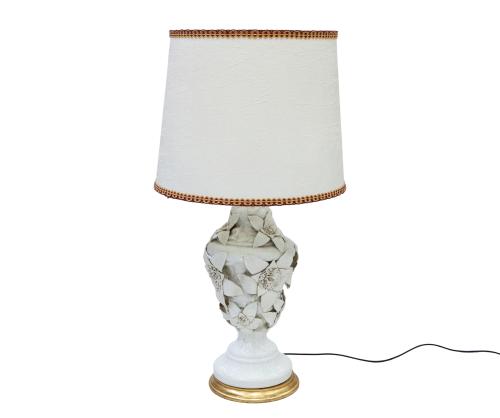 <span class='ref_item'>213 -</span> <span class="object_title">LÁMPARA DE MESA EN CERÁMICA DE MANISES, FÁBRICA BONDÍA (VALENCIA, AÑOS 60)</span>   <p><span class="technical_description">Lámpara de mesa en cerámica de Manises, fabricada por Bondía (Cuart de Poblet, Valencia). Modelo blanco con cuerpo profusamente detallado con flores.<br/>Con gran pantalla color crema y ribeteada con trenzado granate.<br/>Sobre base de madera con pegatina de fábrica. Cable de alimentación.<br/>Medidas cuerpo: 65cm</span><br></p>