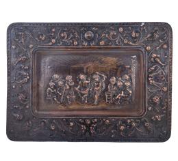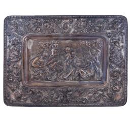 <span class='ref_item'>108 -</span> <span class="object_title">RELIEVE MITOLÓGICO, FRANCIA S.XIX</span>   <p><span class="technical_description">Realizado en metal plateado con relieves de escenas mitológicas. Se representa una escena al dios Baco rodeado por las musas y Putti, con bordes decorados con relieves vegetales.<br/>Medidas: 36 x 49cm<br/> </span><br></p>